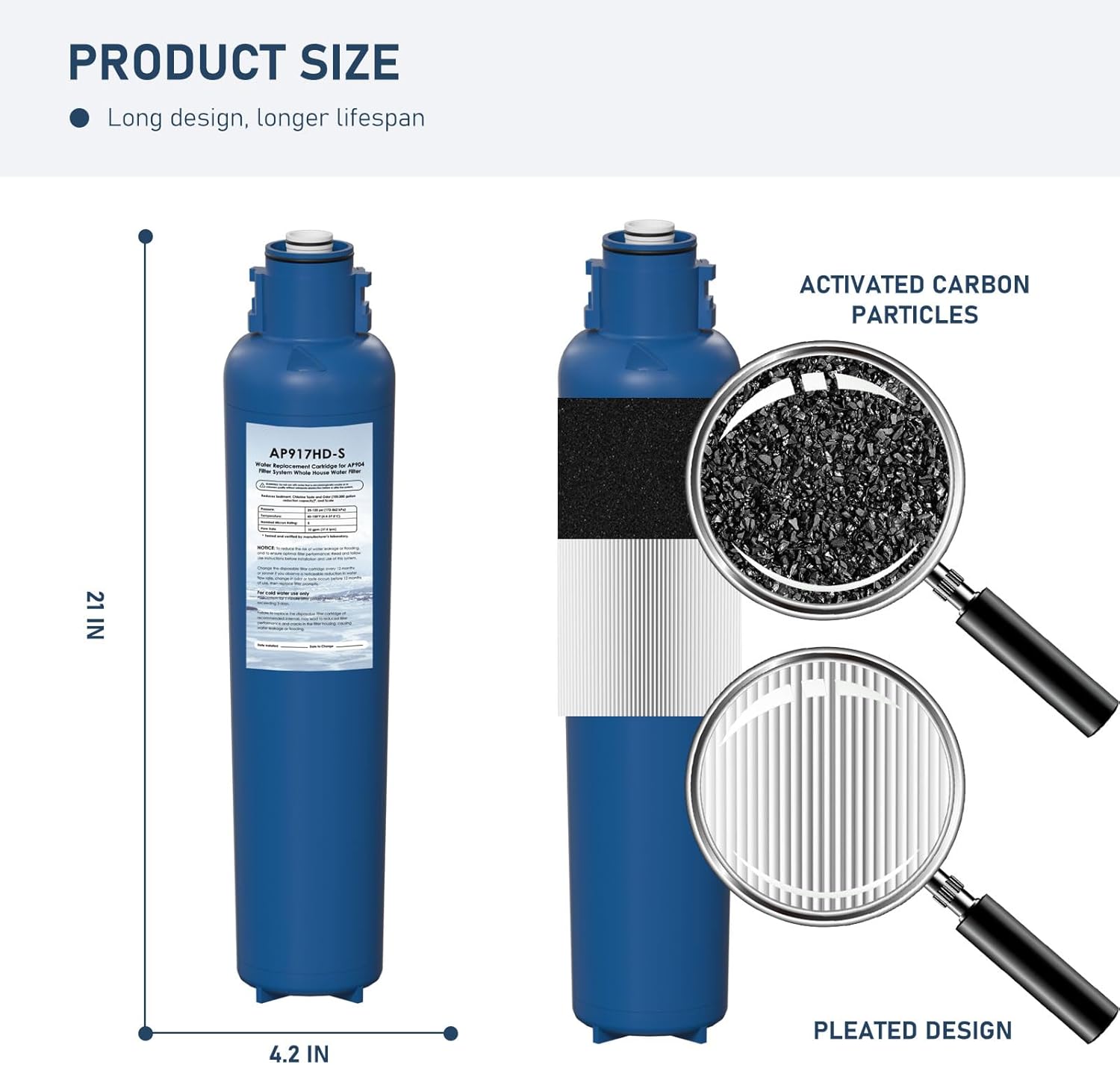 Whole house water filter systems are great solutions to help protect your pipes and appliances from sediment buildup and chlorine, as well as scale, offering you great-tasting drinking water from anywhere in the home. Operation Parameters: Temperature: 40-100ºF (4.4-37.8ºC) Working Pressure: 25-125 PSI (172-862 KPA) Flow Rate: 10 GPM (37.8 LPM) Made from food-grade active coconut carbon block materials. 0.5 microns small pore size, Triple Action Filtration. Tool-free installation and leak-free fit. The AP917HD contains filter media that helps reduce sediment, chlorine taste and odor, and scale. It improves water quality and taste while supplying cleaner, clearer water to every water source point in the house. The scale inhibition feature uses polyphosphates in minute quantities to bind calcium and magnesium hardness minerals, preventing them from precipitating out and building up on metallic surfaces which can reduce flow rates throughout the home’s plumbing system. Replace every 12 months, at 100,000 gallons of use, or sooner if a noticeable reduction in flow occurs.