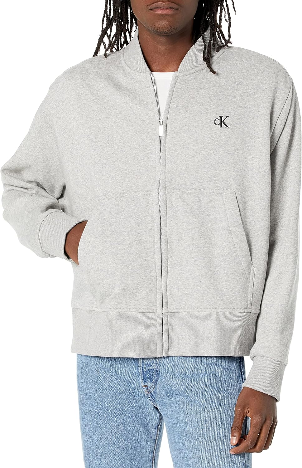 Reimagined classics, iconic Calvin. Designed with an archive-inspired logo, this Calvin Klein bomber jacket features a plush cotton knit fleece blend for premium, all-day comfort. Cut in a relaxed fit with a round collar, a full zip closure and ribbed knit trim.