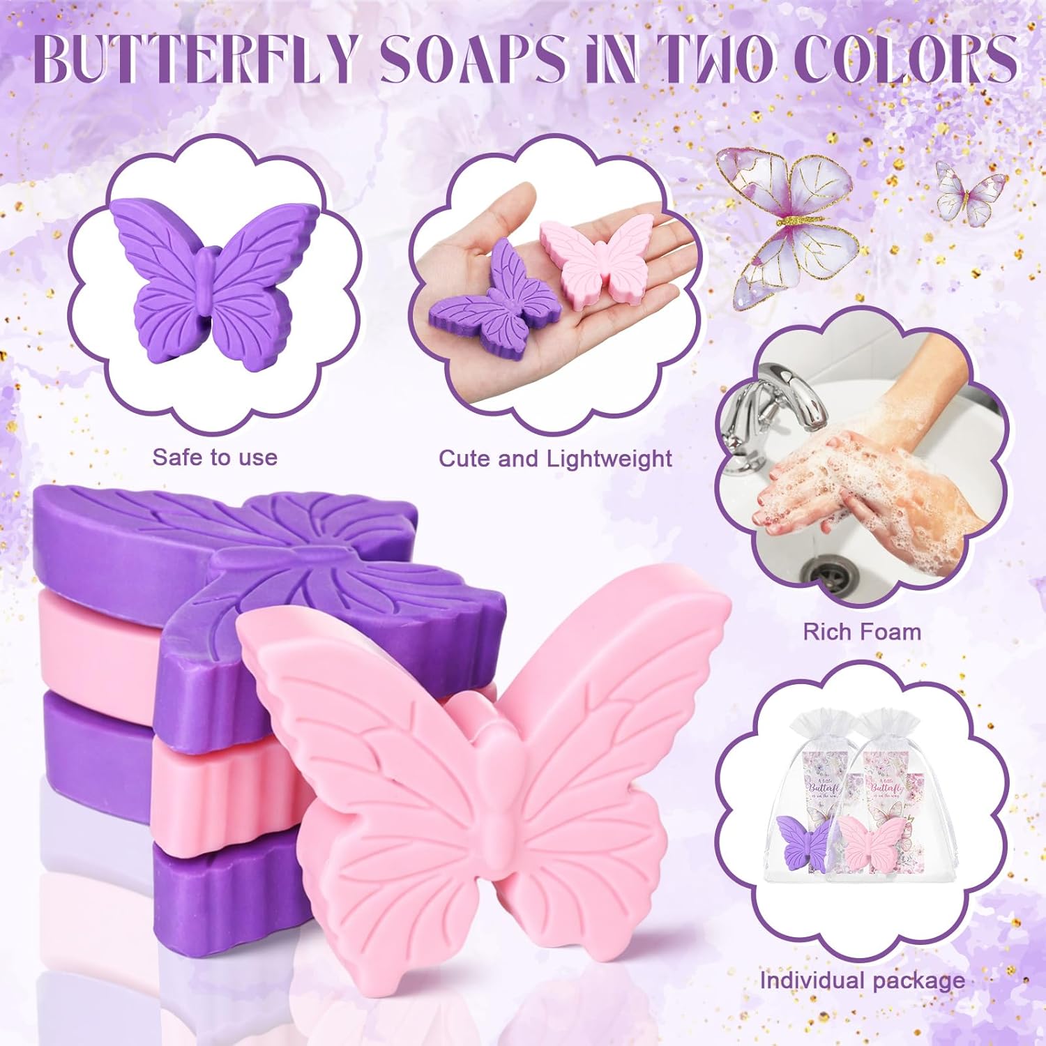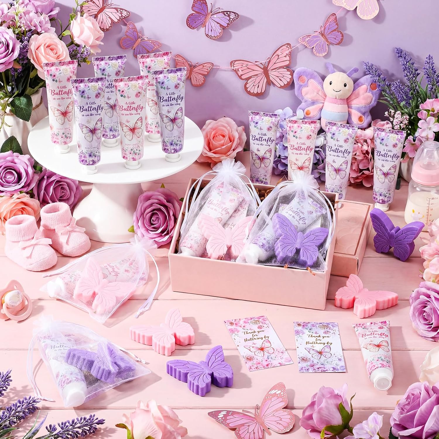 Features: Each set comes with a gold foil thank you card and a sheer organza bag, making assembly quick and easy. Simply place the hand cream and soap inside, tie the bag, and present to your guests as thoughtful party return gifts or table decor. Featuring delicate butterfly-shaped soap and beautifully printed hand cream in pink and purple, these favors add a charming touch to your party tables. The vibrant colors and intricate details make them ideal for butterfly party decorations and memorable guest gifts. Specifications: Material: organza, soap, paper Color: pink, purple Size: Hand creams: 30ml Handmade soap: 30g Gold stamped card: 1.85 x 3.35 inches Organza bag: 0.39 x 0.59 inches Package includes: 48 x Butterfly soaps 48 x Hand creams 48 x Gold stamped cards 48 x Organza bags Notes: Manual measurement, please allow slight errors on size. The color may exist a slight difference due to different screen displays