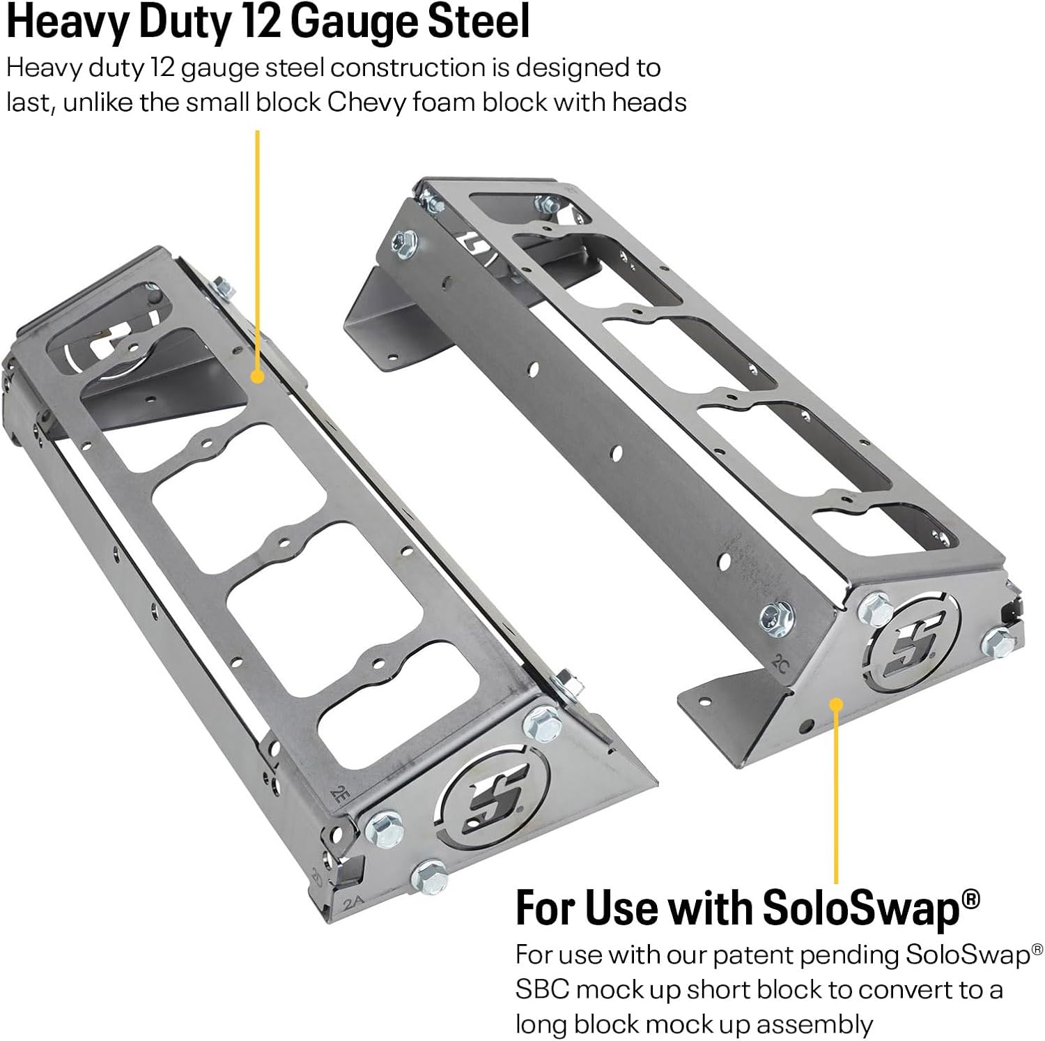 Mock up cylinder heads for our patent pending SoloSwap SBC mock up engine. Laser cut and formed from 12-gauge steel, just like the SoloSwap short block. Accepts all factory and aftermarket bolt-on valve covers, headers, and intakes. Perfect addition to our SoloSwap small block Compatible with Chevy mock up engine short block. Not designed to mount to actual SBC engine blocks without modifications. Add Our Mock Up Cylinder Heads to Your Existing SoloSwap Short Block Our SoloSwap mock up engine blocks are a great resource for individual builders as well as shops looking to make engine swaps easier. They provide a lightweight solution to mocking up the engine in a car that never had said engine type from the factory. Though offered in both short block and long block variants for mock up engine purposes, many of our customers purchasing the short block version of our patent pending SoloSwap mock up block have asked us to offer the long block's mock up cylinder heads separately for use on the SoloSwap short block replica engines customers already own. We heard you loud and clear and you can now purchase our SoloSwap mock up long block cylinder heads separately. Small Block Compatible with Chevy Mock Up Cylinder Heads Provide Complete Long Block Mock Up Needs Our SoloSwap SBC cylinder heads come directly from our long block mock up engine block replica engines product. Meaning that these mock up cylinder heads will bolt directly to the mock up engine short block you already own with zero modifications, unlike plastic engines where the heads are molded directly into the long block plastic engine block. These mock up cylinder heads are not designed to bolt to actual production cylinder block castings, though with some modifications to the mounting bolt hole diameter and using the properly sized hardware, it may be possible to bolt these mock up heads to a production cylinder block casting if you wish