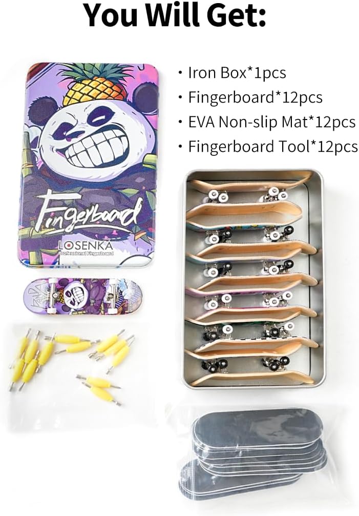 | Included Components | 12pcs Complete Fingerboard, 12pcs EVA Non-slip Mat, 12pcs Fingerboard Tool, 1pcs Iron Box |