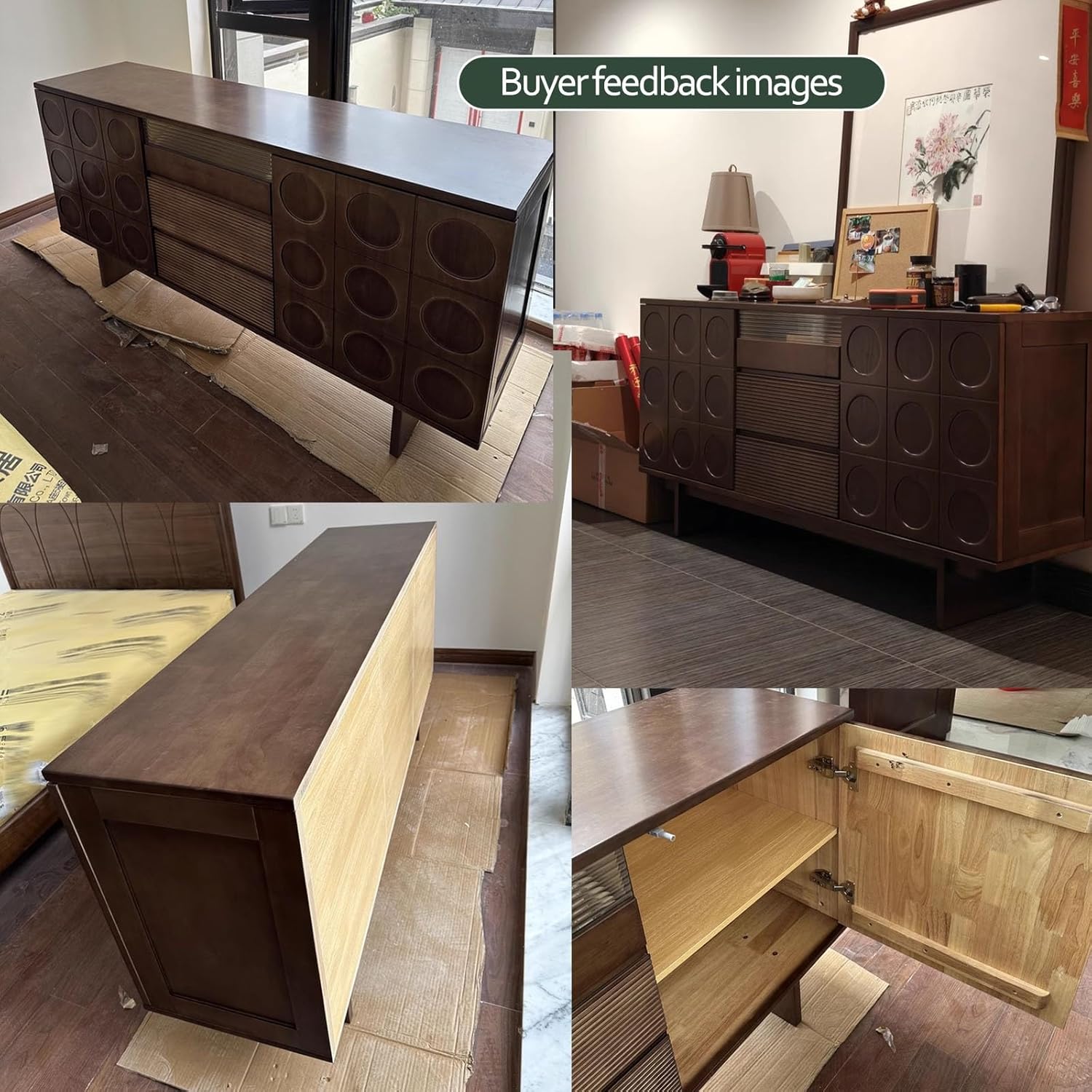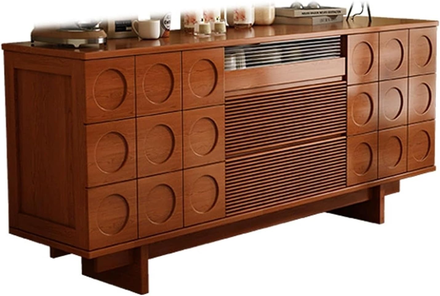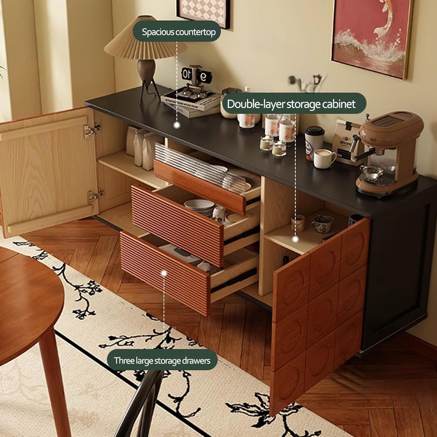 HOLGVE Designed with two doors and three drawers, this sideboard cabinet offers versatile storage for your dining essentials and everyday items.Behind the doors, adjustable shelves allow you to customize the interior layout to suit your needs.Built with a robust frame, the sideboard ensures long-lasting durability while retaining its sleek, modern aesthetic.Featuring high-quality hardware—including soft-close hinges and smooth-glide drawer runners—this buffet cabinet operates quietly and effortlessly.Product Name: Sideboard Buffet Cabinet, Buffet Cabinet, Sideboard Buffet, Sideboard Cabinet, Storage Cabinet, Coffee Bar Cabinet, Coffee Bar Table, Console Table, Fluted Sideboard Buffet Cabinet, Large Sideboard Buffet CabinetProduct Material: WoodColor: Black+vintage , Vintage+black , Black+walnut , Walnut+black , Vintage , Black , Natural wood , WalnutSize: 160x40x78cm/63x15.7x31.1inApplicable places: Perfect as a kitchen buffet, dining room sideboard, living room coffee bar, or entryway cabinet. Package Content:- 1 x Buffet Storage Cabinet- 1 x AccessoriesNote:1. We are manually measuring, there may be an error of 3 - 5 cm, please prevail in kind;2. The color may exist a slight difference due to different screen displays;3. There are only storage rack, other products are shooting props;